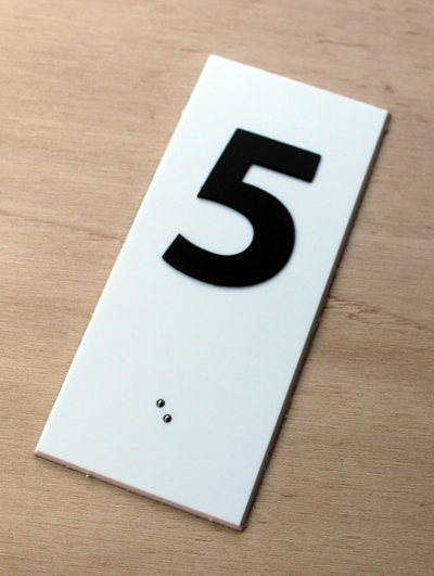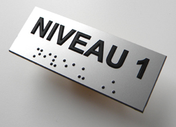 Plaque en PVC Texte en gravure Braille :insertion de billes acryliques ou inox Fraisage : découpe à la forme et défonce Finition : dos adhésivé Visuel : sur mesure